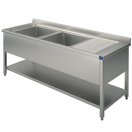 plonge, 2 bacs, égouttoir à droite, sur piètement, avec étagère inférieure, 1800x700 mm