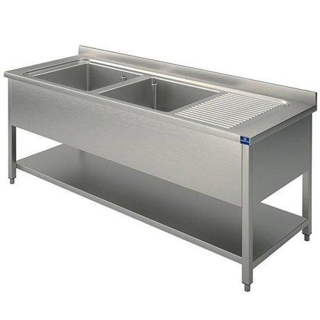 plonge, 2 bacs, égouttoir à droite, sur piètement, avec étagère inférieure, 2000x700 mm