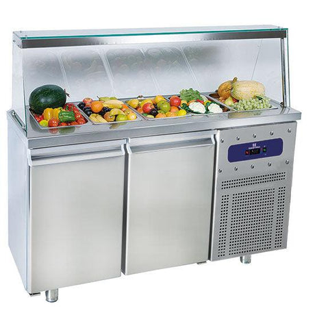 Saladette avec 2 portes GN 1/1 et structure en verre, 4x GN 1/1 h=150 mm, -2°/+8°C