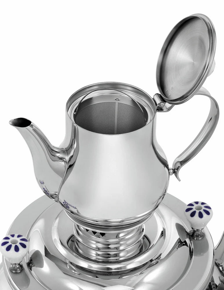 Ce samovar se distingue par son design classique et ses poignées en céramique décorées, ajoutant une touche d'élégance à votre service. Grâce à sa théière en acier inoxydable de 2 litres avec passoire à thé, vous pouvez préparer une quantité importante de thé en une seule fois. Les commandes électroniques et manuelles vous offrent une grande flexibilité et un contrôle précis de la température.